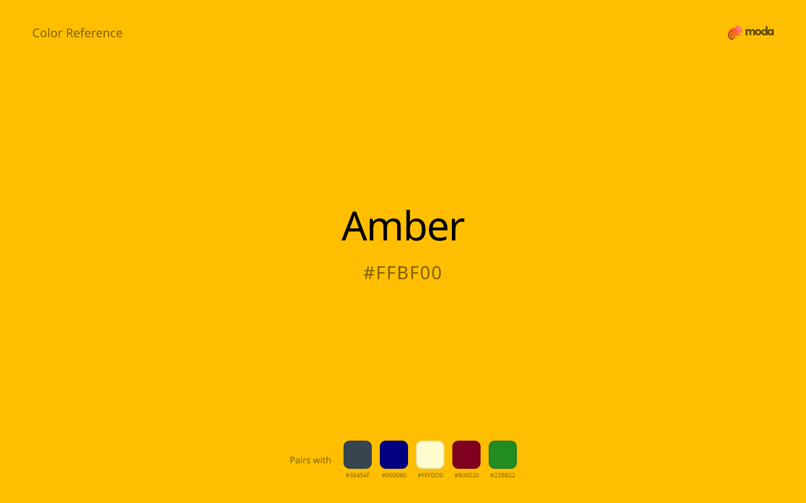 The hex code for amber is #FFBF00. In RGB, that's 255 red, 191 green, and 0 blue. The approximate CMYK equivalent is 0% cyan, 25% magenta, 100% yellow, and 0% key (black).