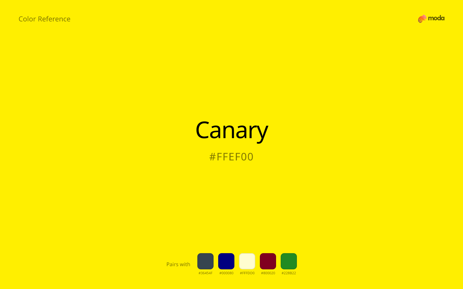 Canary is often read as optimistic, celebratory, and high-energy. Compared with lemon's slight green cast, canary typically feels warmer and more golden-sun; compared with pure yellow, it is often perceived as a touch richer and less clinical.