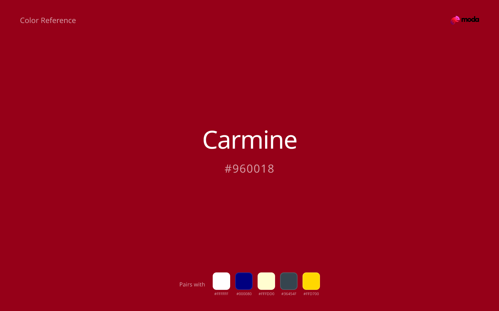 Carmine is a deep red with a cool, velvety cast — less brown than wine, less black than dark red, with a stained-glass richness. #960018 suits wine labels, bar menus, gothic romance aesthetics, and editorial mastheads where you want gravity without losing clear redness.