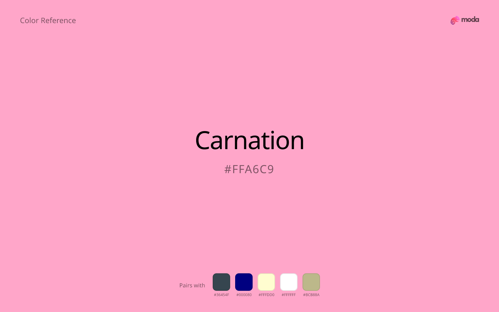 The hex code for carnation is #FFA6C9. In RGB, that's 255 red, 166 green, and 201 blue. The approximate CMYK equivalent is 0% cyan, 35% magenta, 21% yellow, and 0% key (black).