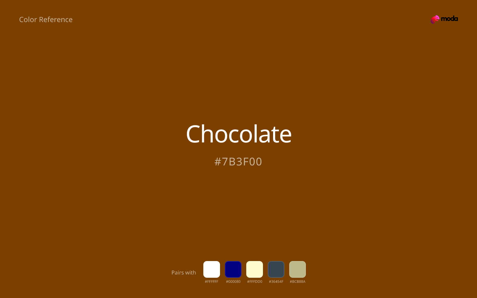 - •Chocolate's depth makes it effective for premium packaging, dark-mode interfaces, and editorial layouts that need gravitas without defaulting to black.
