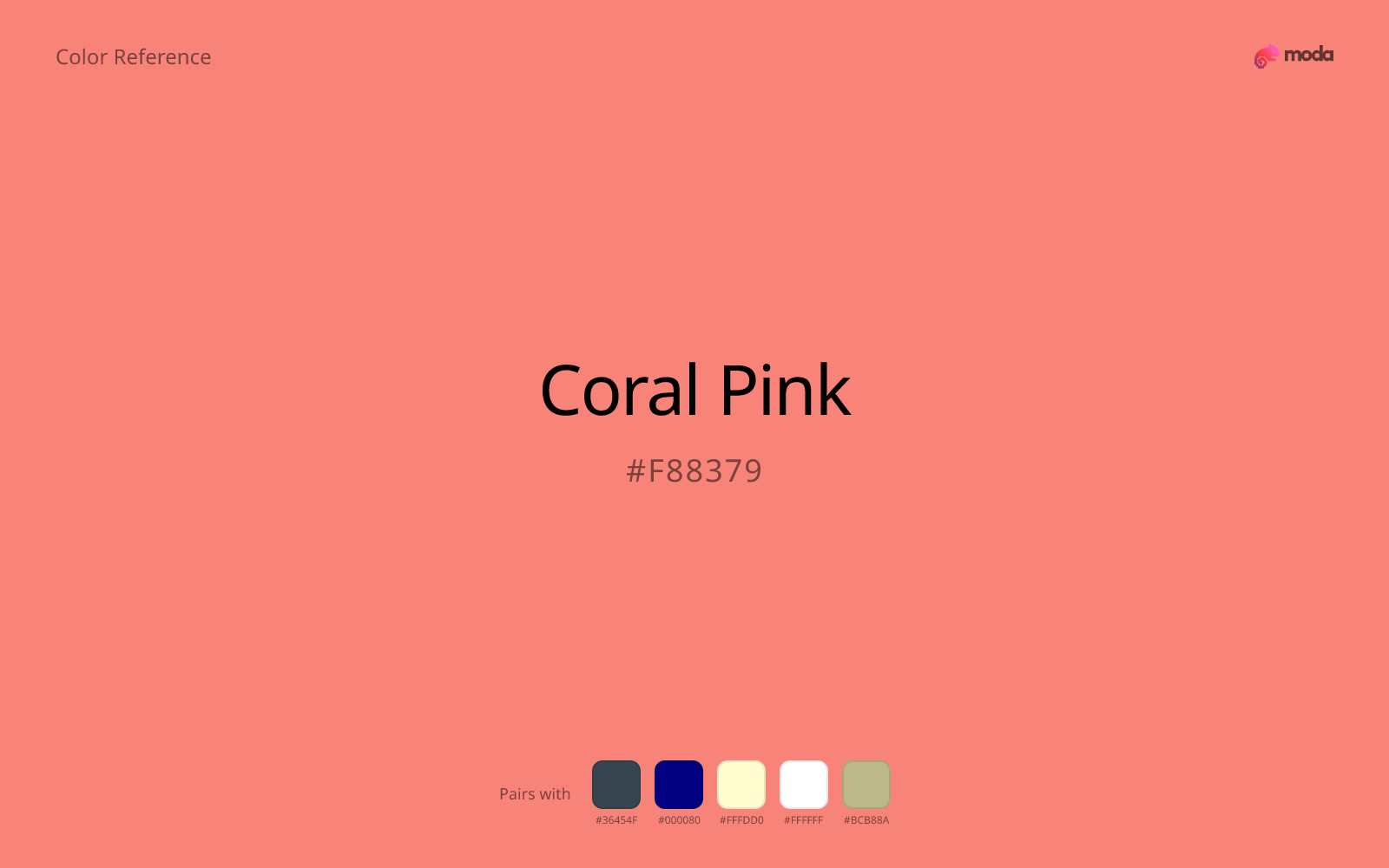 The hex code for coral pink is #F88379. In RGB, that's 248 red, 131 green, and 121 blue. The approximate CMYK equivalent is 0% cyan, 47% magenta, 51% yellow, and 3% key (black).