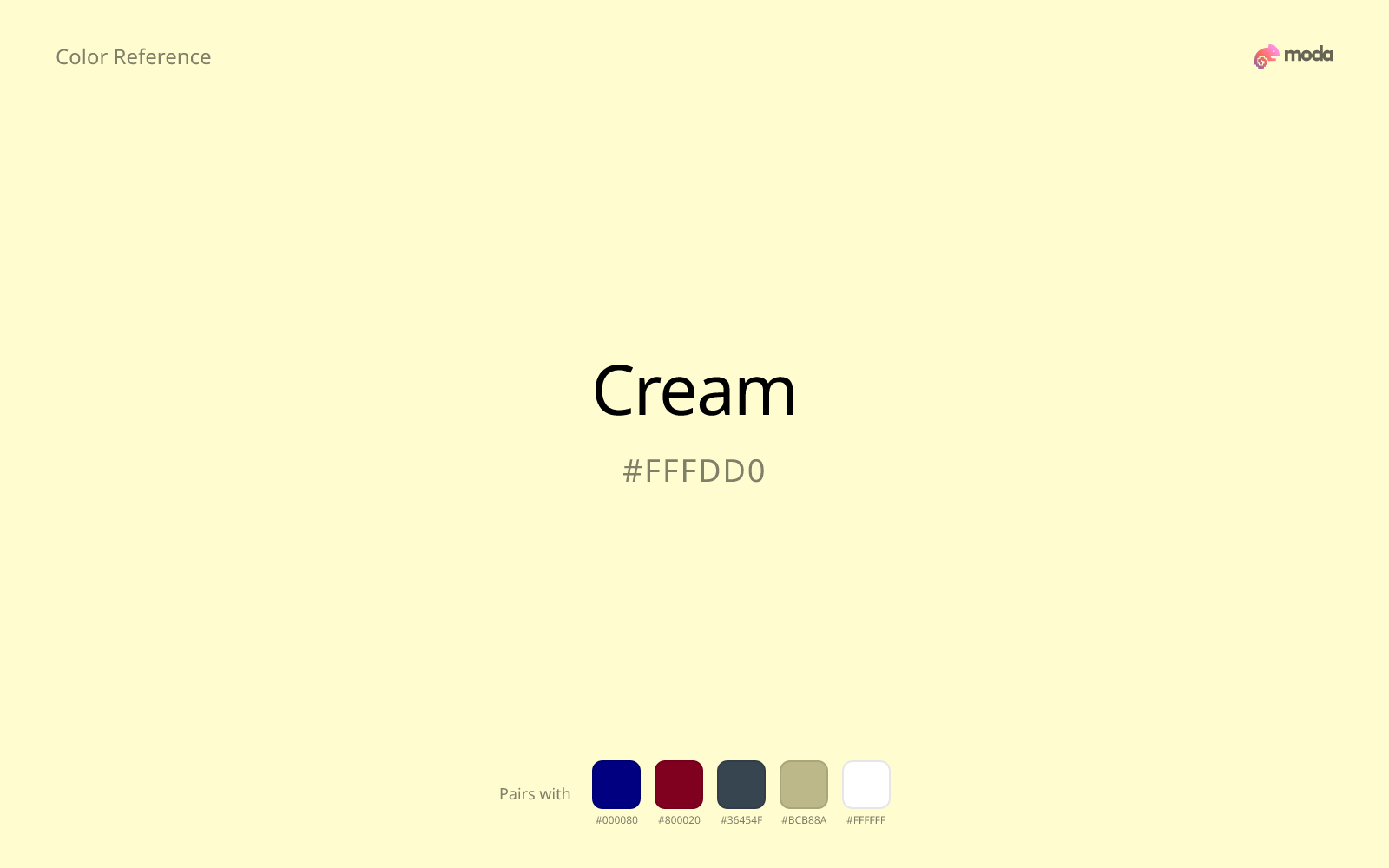 Cream is very light, so it works best as a background, card fill, or table tint in slides, documents, and landing pages. Pair it with dark text such as charcoal or navy for readability.
