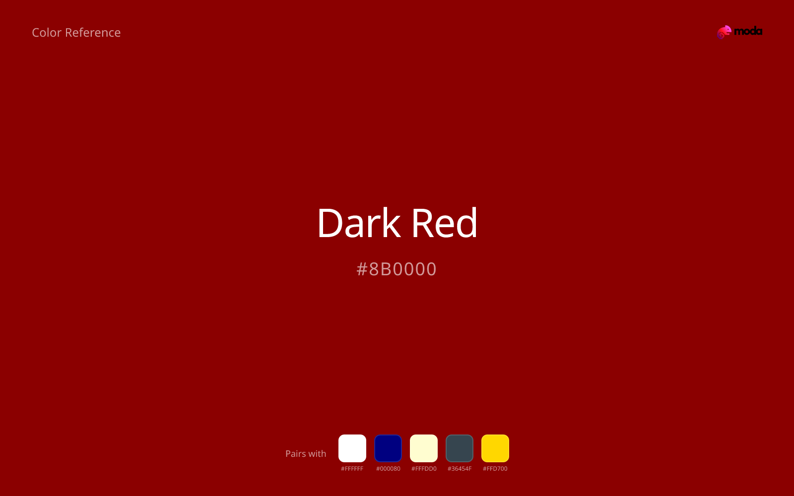 Dark red is red pushed toward night — still clearly red, but heavy enough to behave like a near-neutral anchor. #8B0000 is ideal for typography accents, leather-like UI chrome, and cinematic key art where you need drama without neon. Its job is weight, not sparkle.