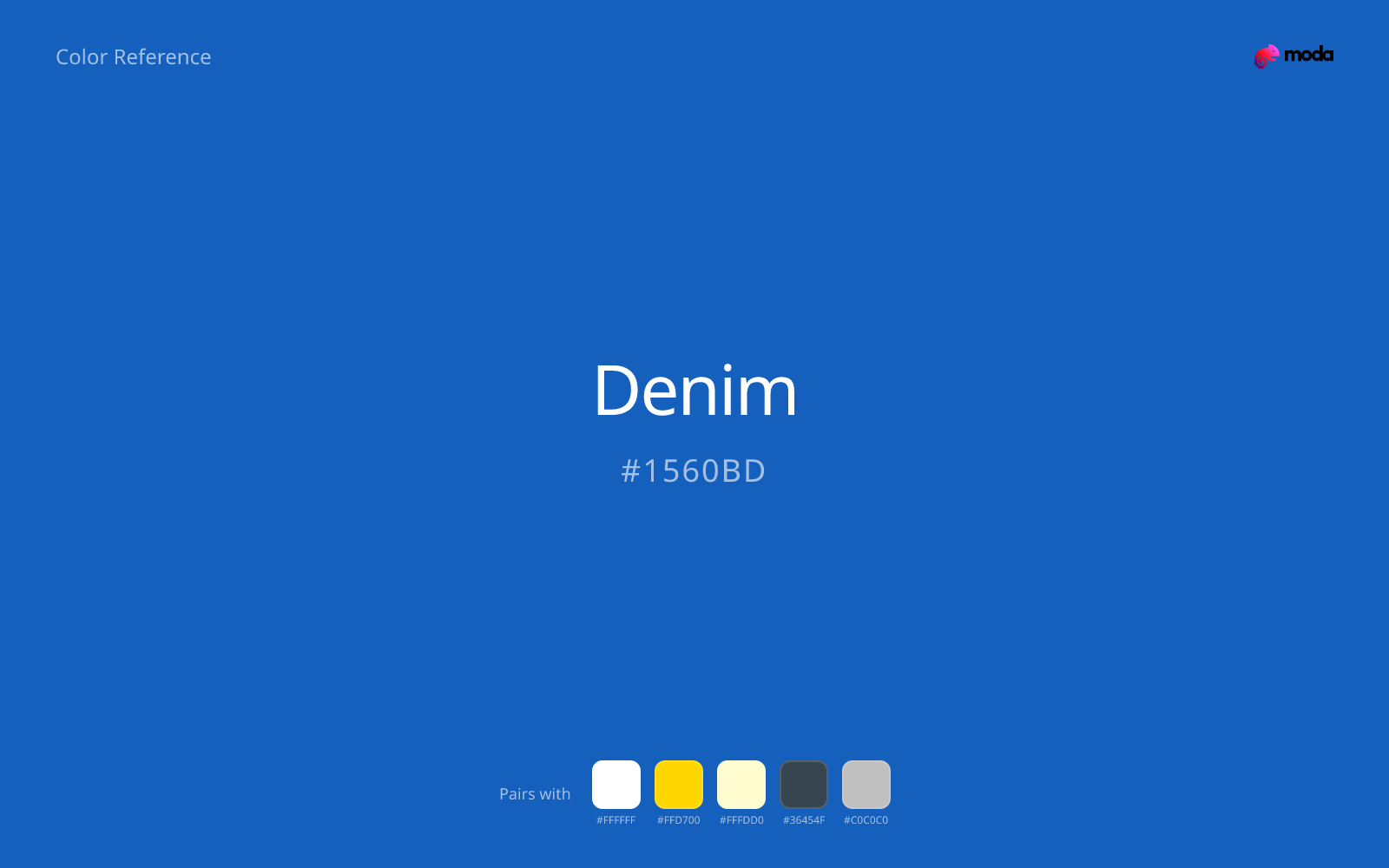The hex code for denim is #1560BD. In RGB, that's 21 red, 96 green, and 189 blue. The approximate CMYK equivalent is 89% cyan, 49% magenta, 0% yellow, and 26% key (black).