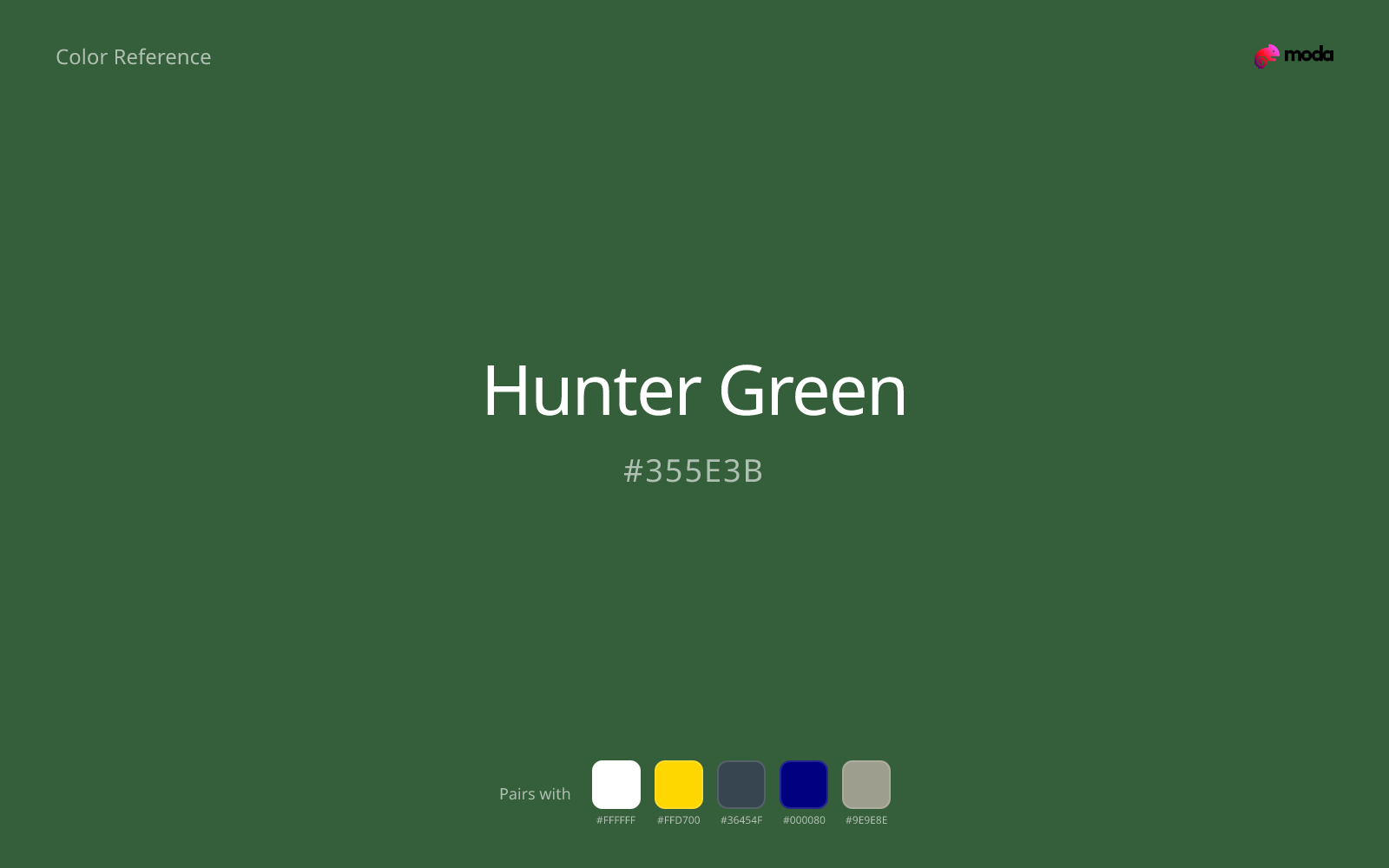 The hex code for hunter green is #355E3B. In RGB, that's 53 red, 94 green, and 59 blue. The approximate CMYK equivalent is 44% cyan, 0% magenta, 37% yellow, and 63% key (black).