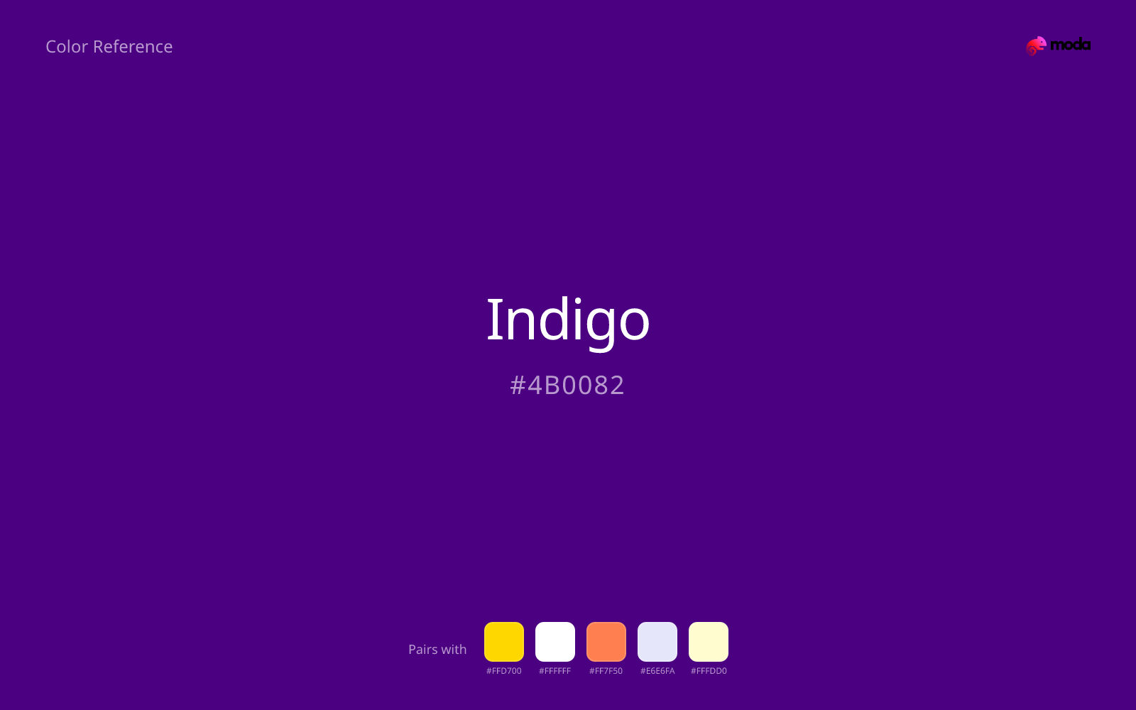 Indigo (#4B0082) is a deep blue-violet that sits between blue and purple on the spectrum. It conveys depth, wisdom, and creative authority — making it a sophisticated alternative to navy for brands that want distinction.