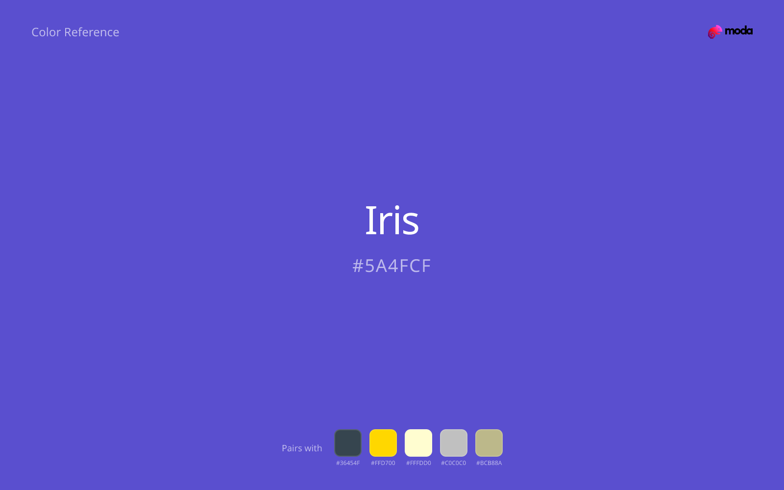 The hex code for iris is #5A4FCF. In RGB, that's 90 red, 79 green, and 207 blue. The approximate CMYK equivalent is 57% cyan, 62% magenta, 0% yellow, and 19% key (black).