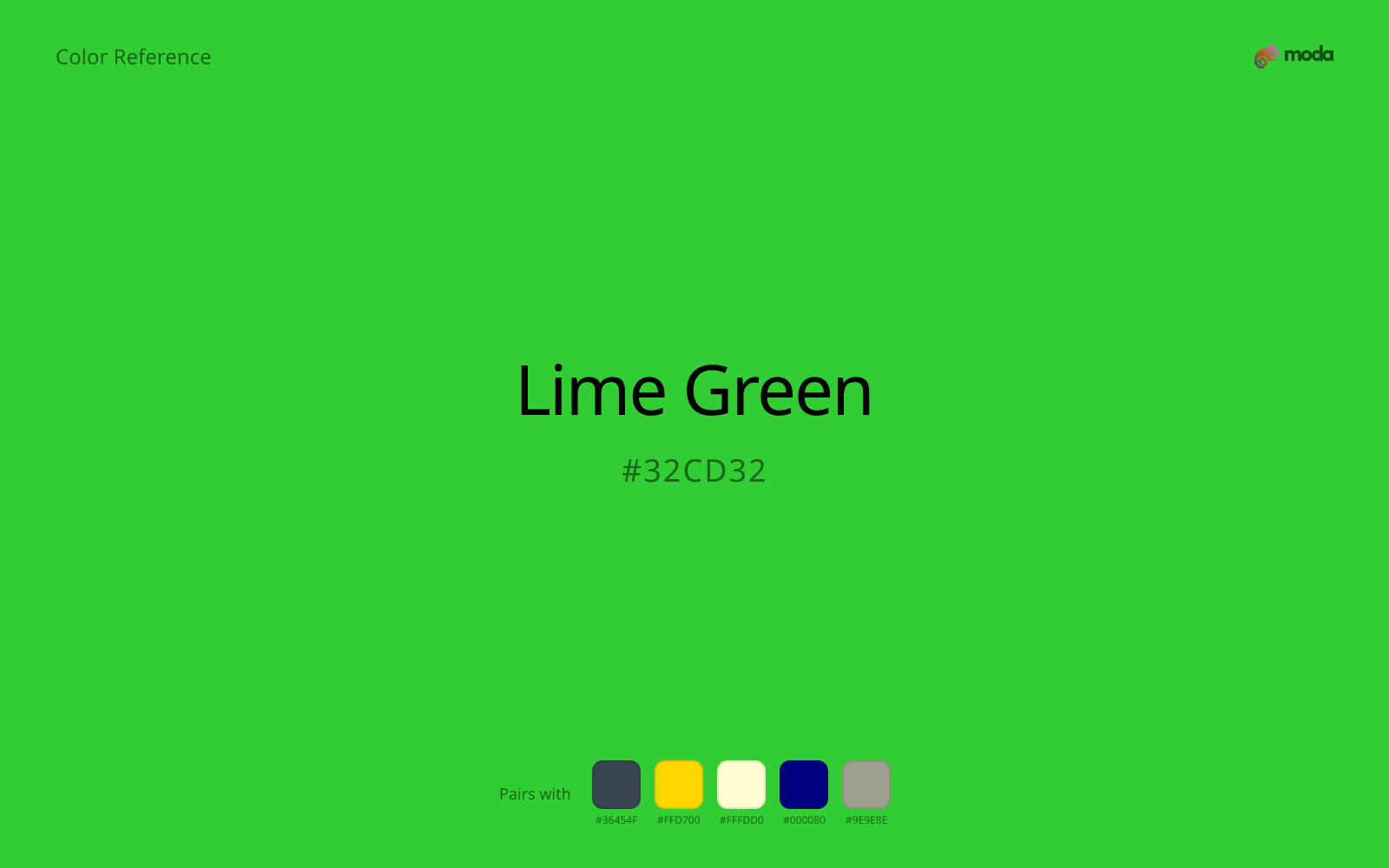 "Lime green" is used loosely for several yellow-leaning greens, which is why different tools and brands do not always point to the exact same hex. In practice, #32CD32 reads as the familiar sports-uniform or packaging version: bright, grassy, and easier to use than fluorescent neon green.