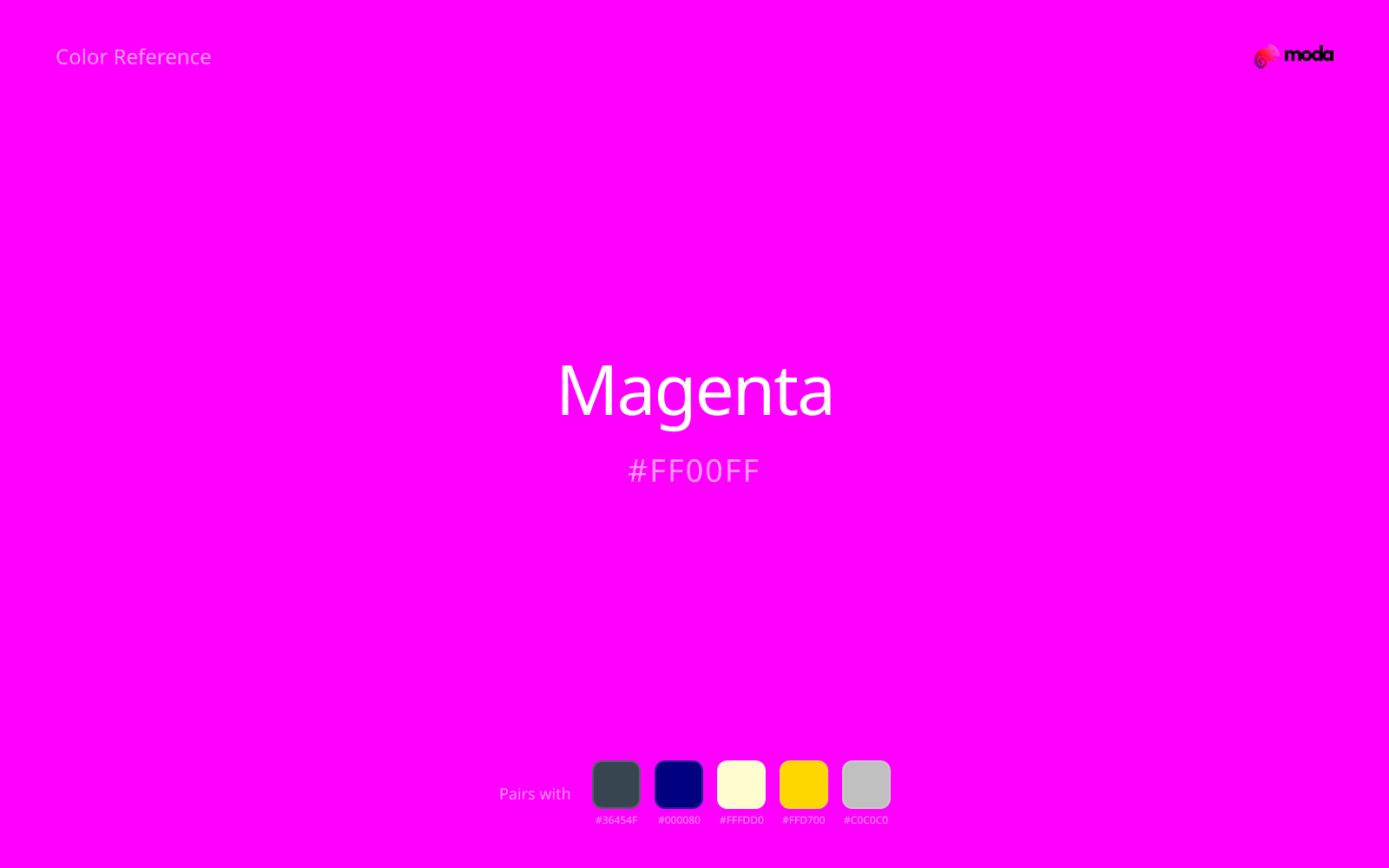 Magenta is the synthetic shout between red and blue — so pure on RGB displays that it can feel like a primary color of light. #FF00FF does not pretend to be natural foliage; it is ink, LED, and printer calibration. Small doses read as accent, large fields can vibrate.