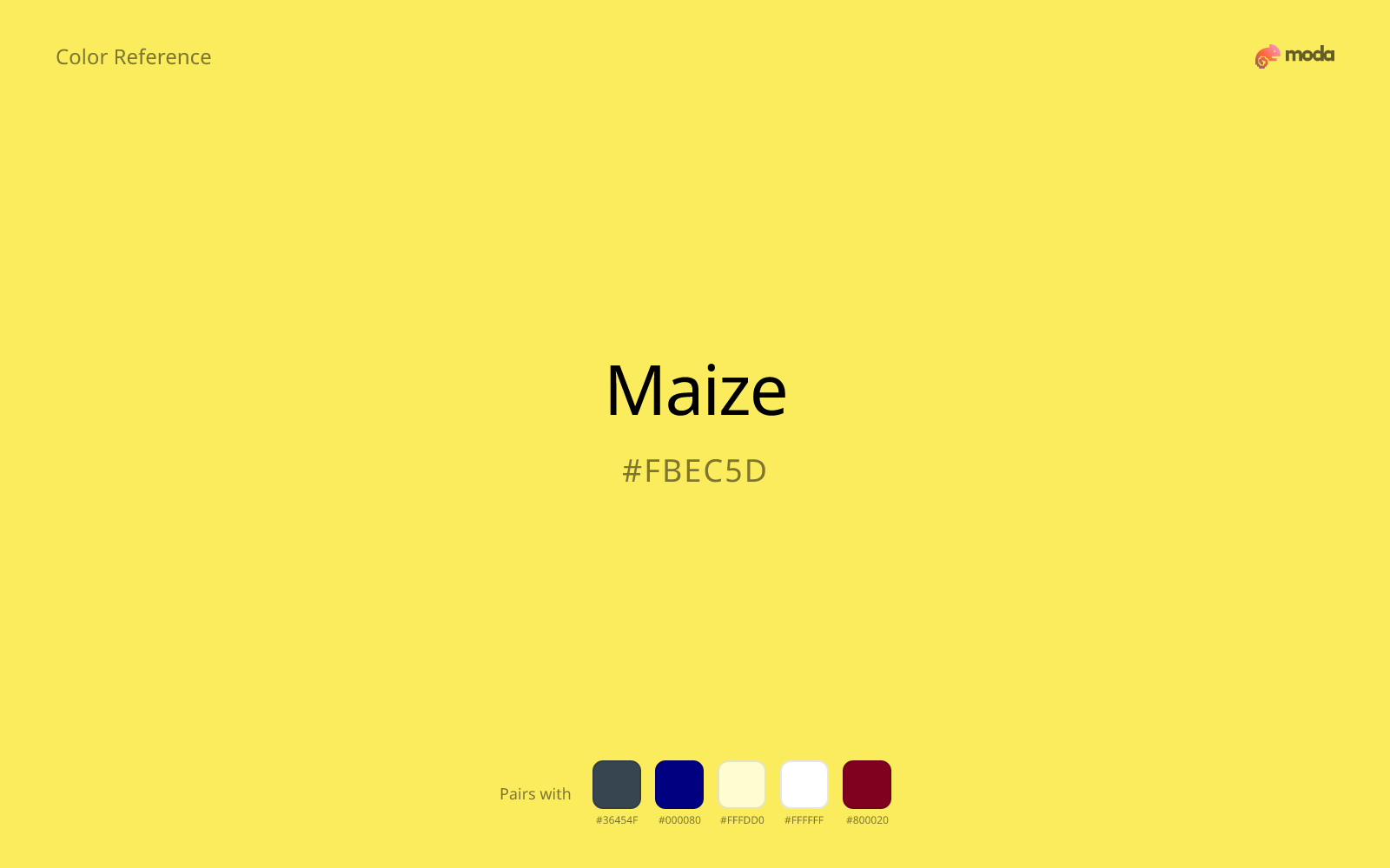 The hex code for maize is #FBEC5D. In RGB, that's 251 red, 236 green, and 93 blue. The approximate CMYK equivalent is 0% cyan, 6% magenta, 63% yellow, and 2% key (black).