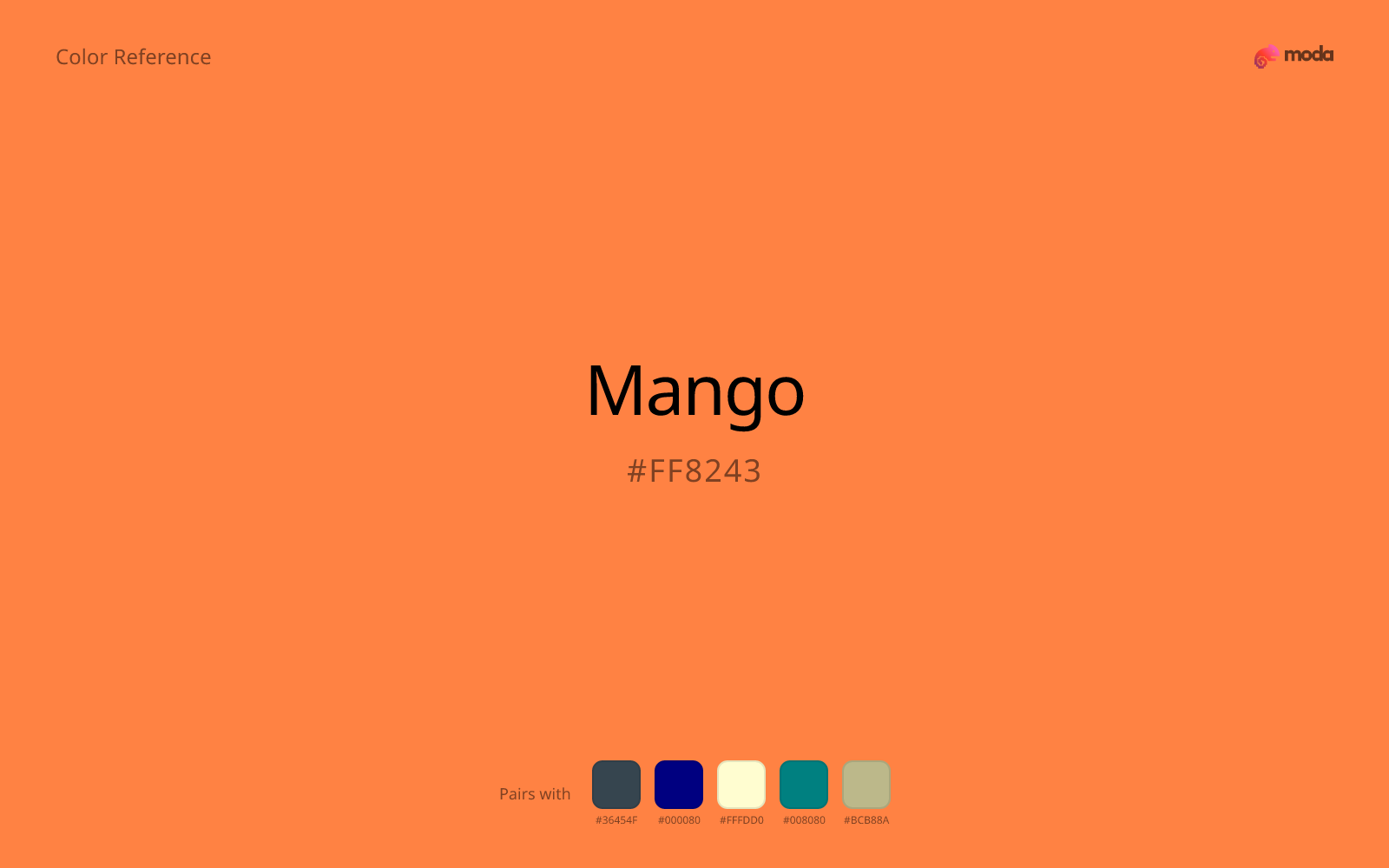The hex code for mango is #FF8243. In RGB, that's 255 red, 130 green, and 67 blue. The approximate CMYK equivalent is 0% cyan, 49% magenta, 74% yellow, and 0% key (black).