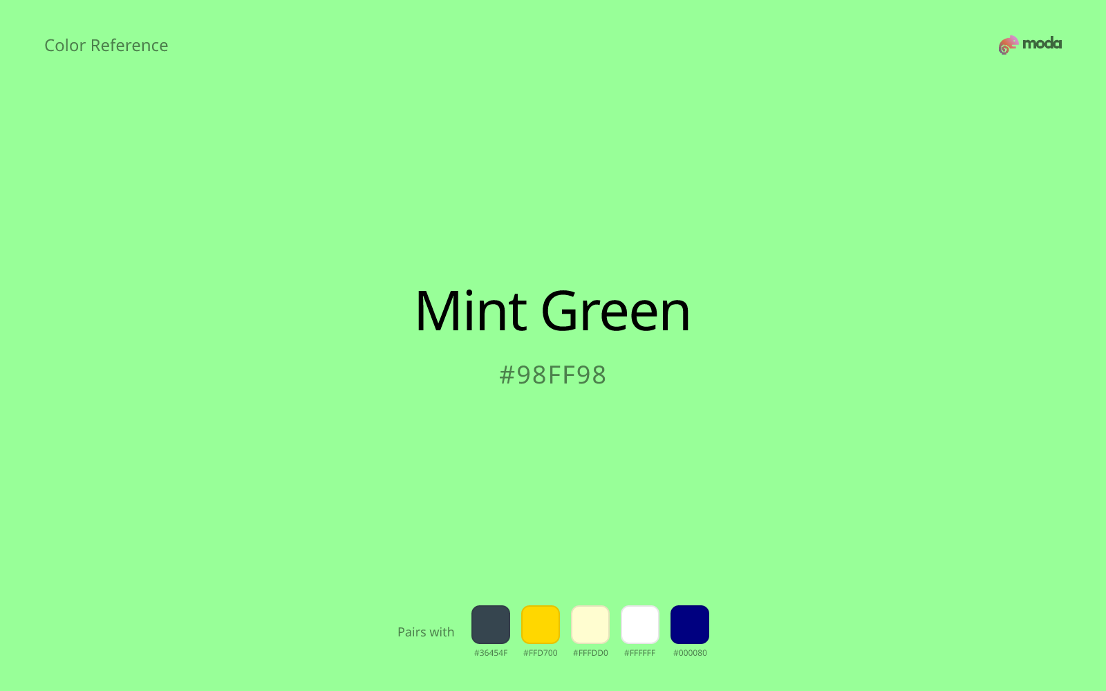 Mint green (#98FF98) is a bright, fresh pastel green that feels clean, calming, and youthful. It works for health, wellness, and consumer brands seeking a friendly, approachable palette.