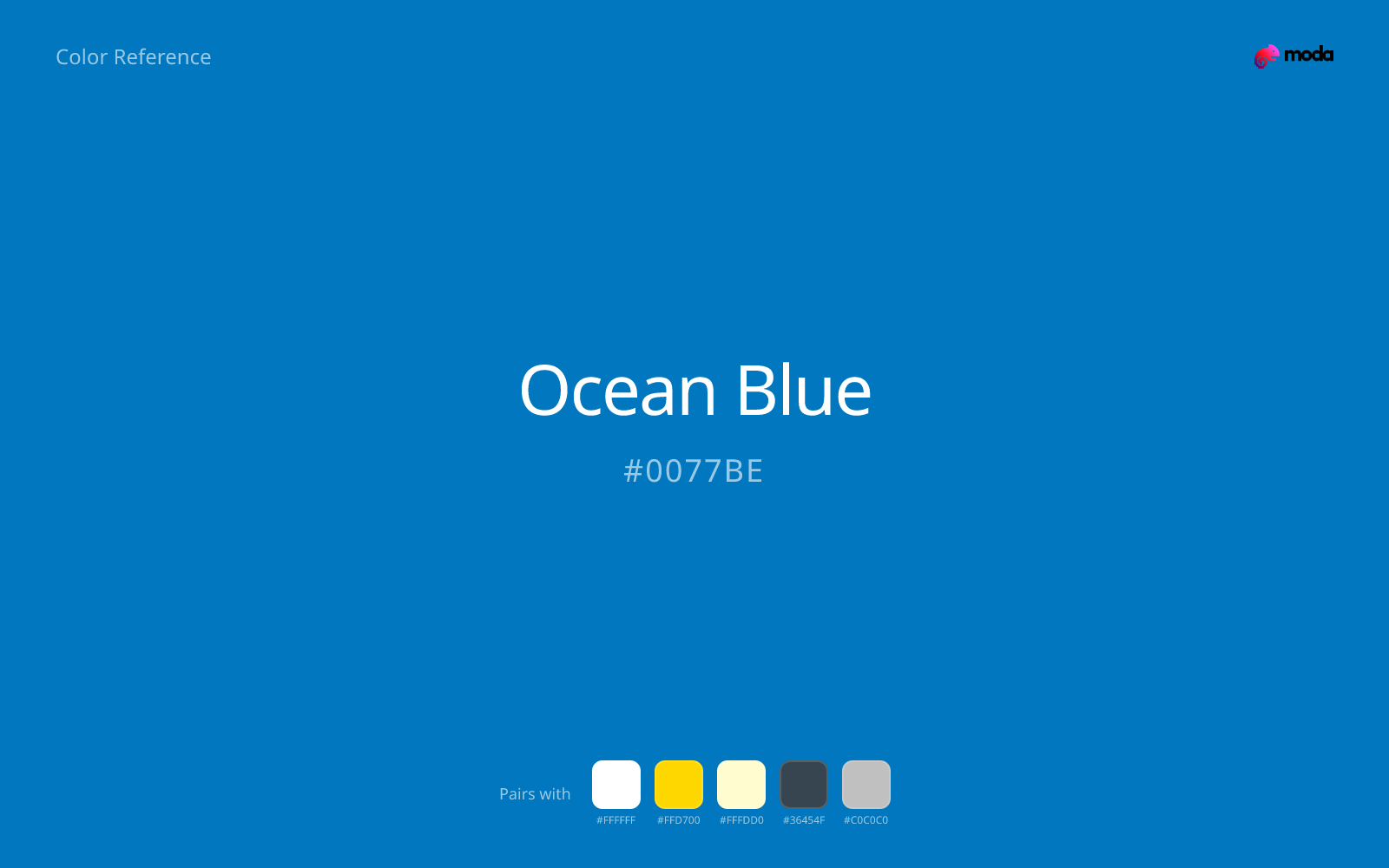 The hex code for ocean blue is #0077BE. In RGB, that's 0 red, 119 green, and 190 blue. The approximate CMYK equivalent is 100% cyan, 37% magenta, 0% yellow, and 25% key (black).