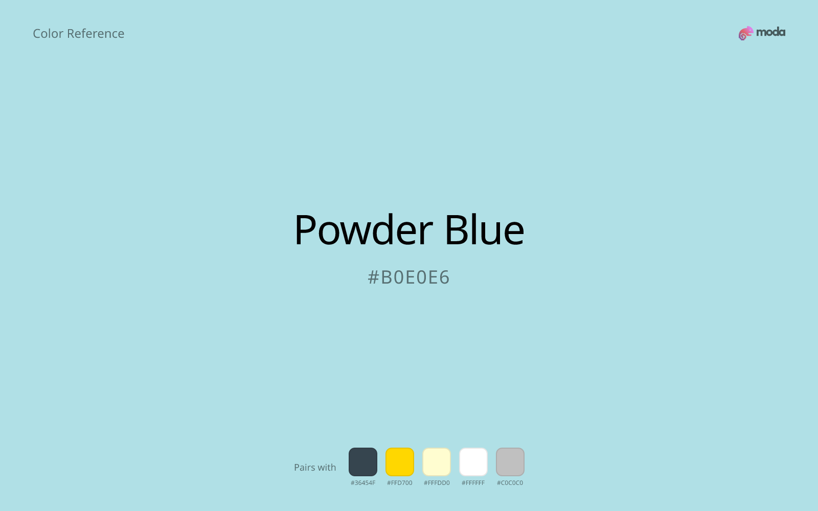 The hex code for powder blue is #B0E0E6. In RGB, that's 176 red, 224 green, and 230 blue. The approximate CMYK equivalent is 23% cyan, 3% magenta, 0% yellow, and 10% key (black).