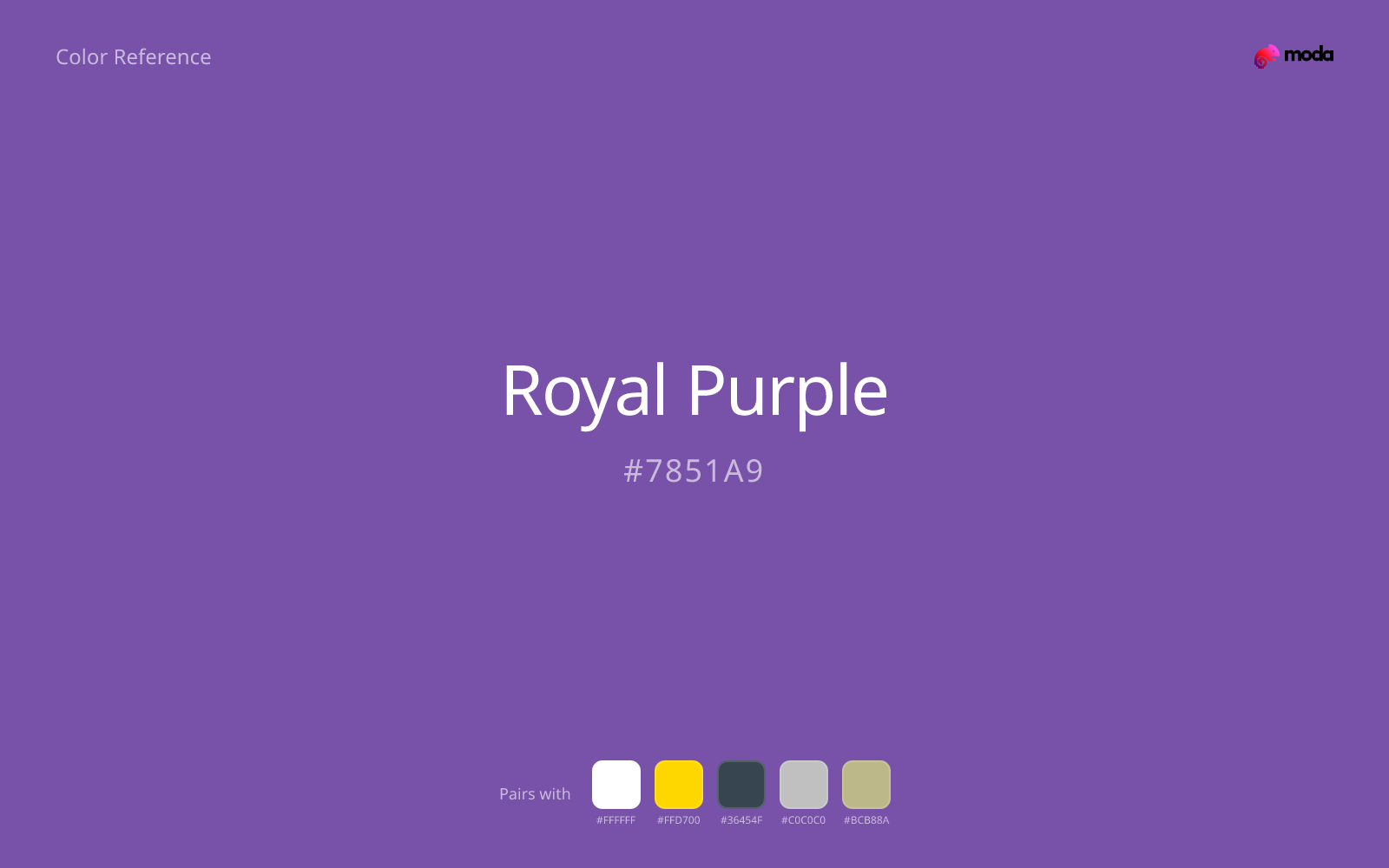 The hex code for royal purple is #7851A9. In RGB, that's 120 red, 81 green, and 169 blue. The approximate CMYK equivalent is 29% cyan, 52% magenta, 0% yellow, and 34% key (black).