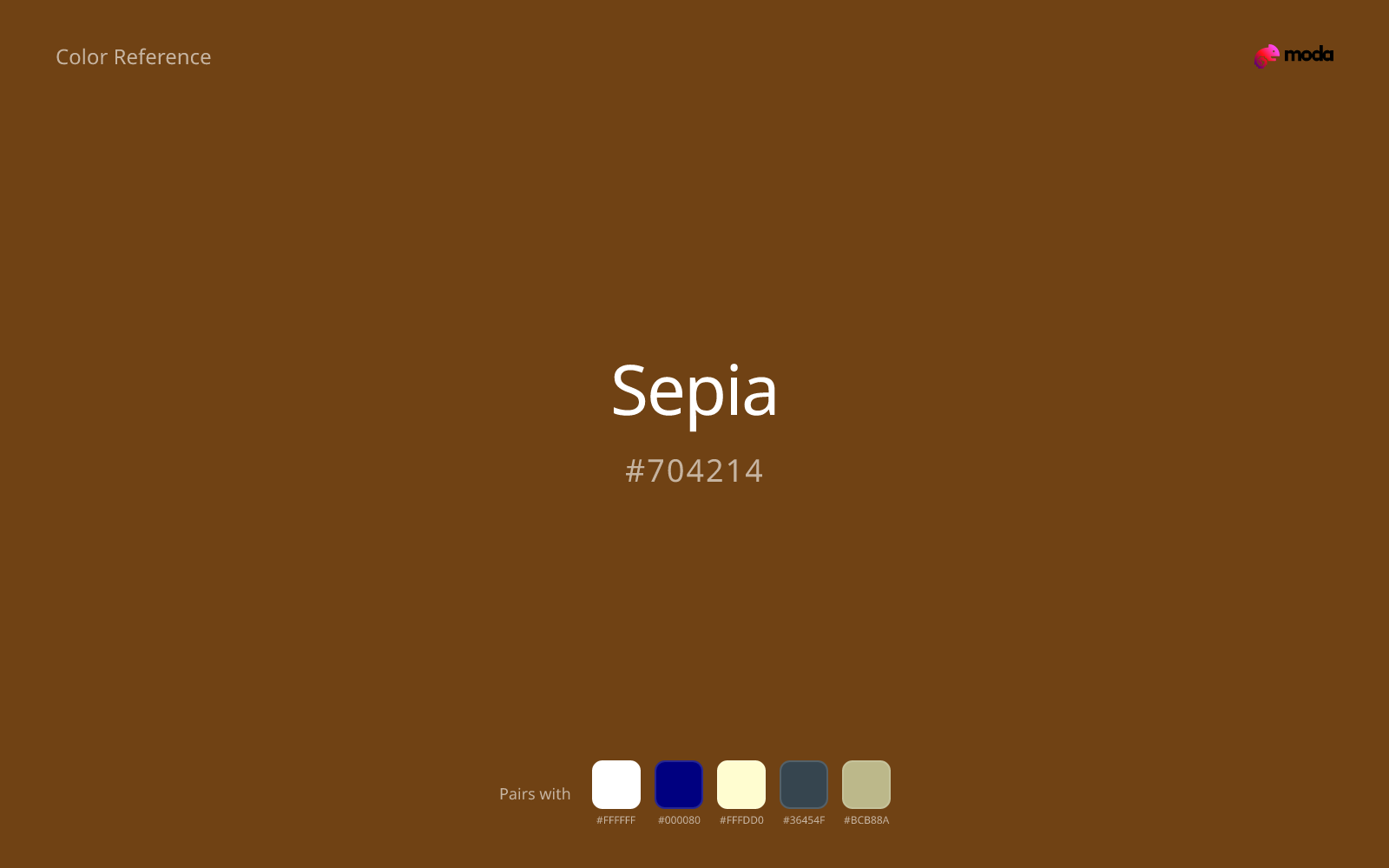 Sepia has enough depth to anchor a layout while still reading as a color, which makes it useful for dark section blocks, headlines, and heavier accents.