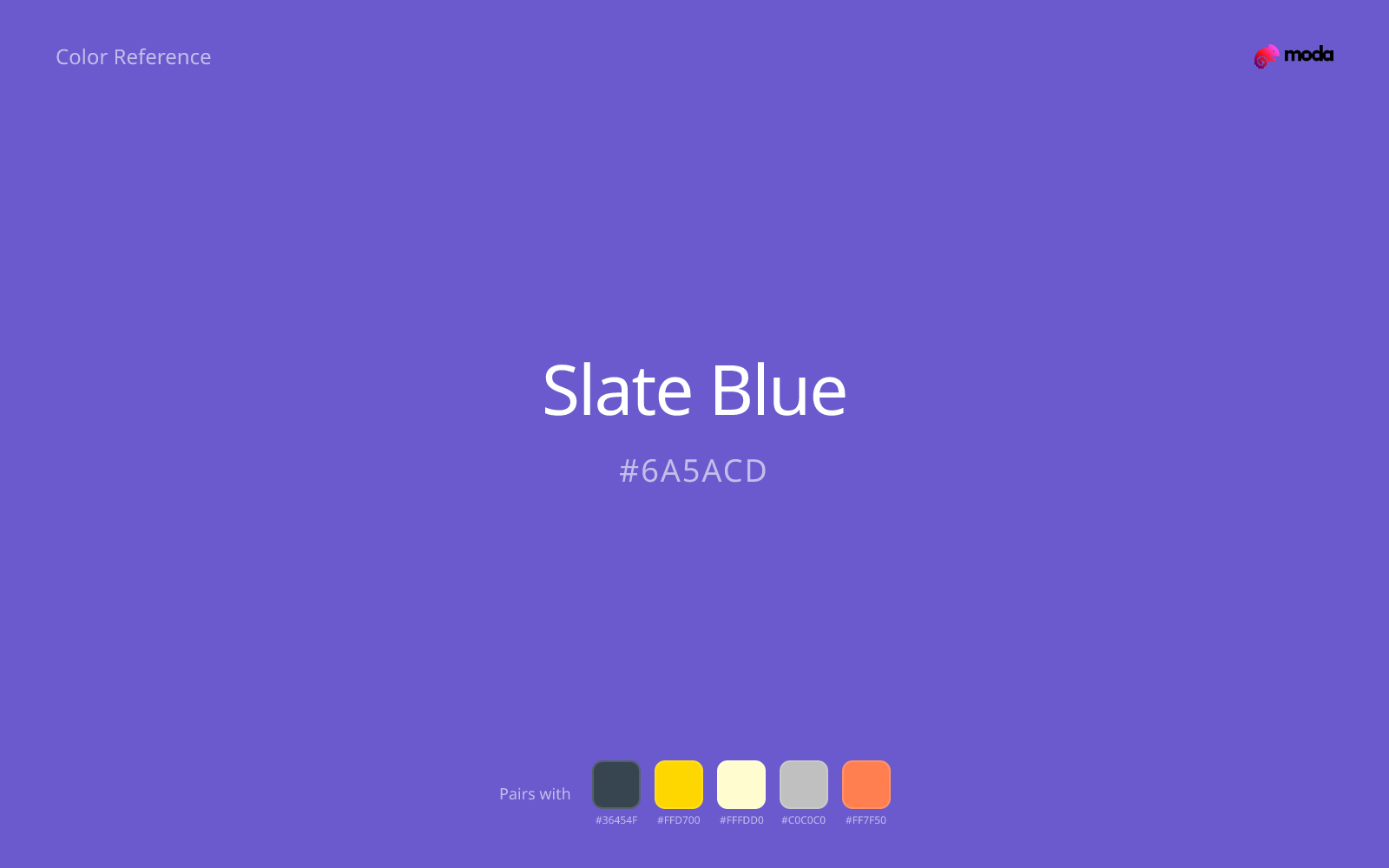 The hex code for slate blue is #6A5ACD. In RGB, that's 106 red, 90 green, and 205 blue. The approximate CMYK equivalent is 48% cyan, 56% magenta, 0% yellow, and 20% key (black).