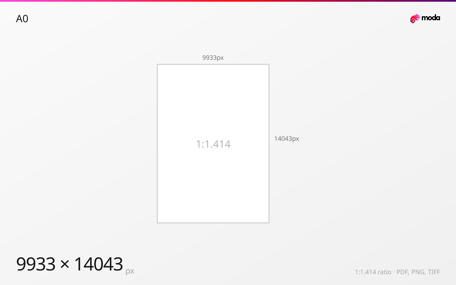 A0 paper is 841×1189mm (33.11×46.81 inches). At 300 DPI, that's 9933×14043 pixels. A0 is the largest standard size in the ISO A series — it has an area of exactly 1 square meter. It's used for technical drawings, architectural plans, large posters, and scientific conference displays.