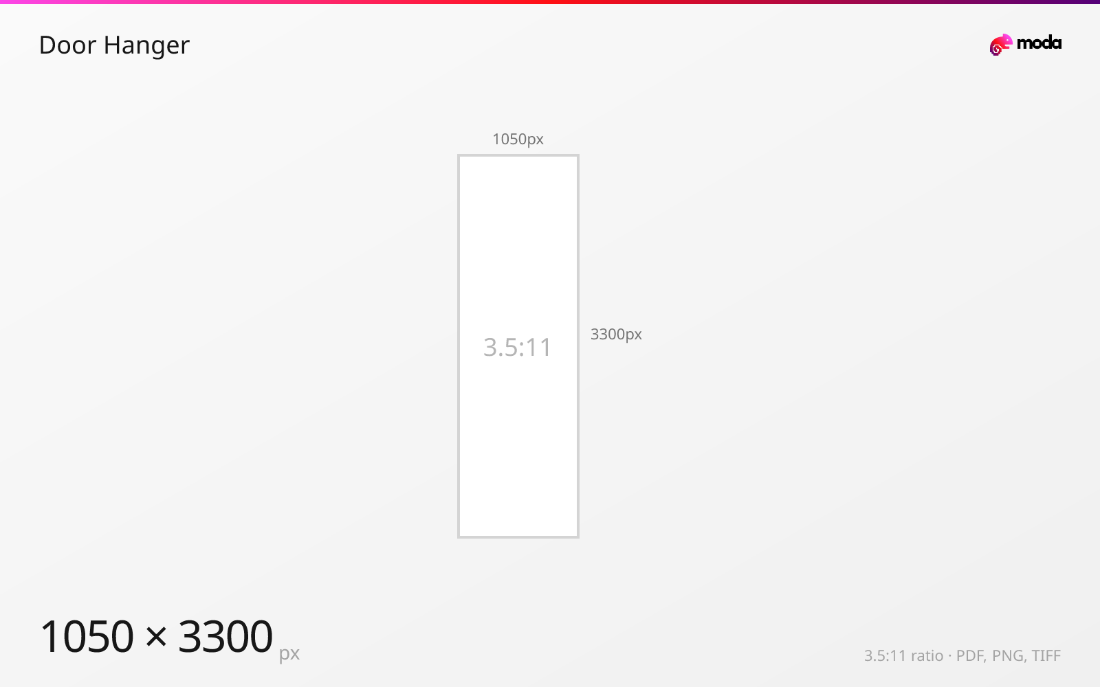 The standard door hanger size is 88.9 × 279.4 mm (3.5 × 11 inches), or 1050 × 3300 pixels at 300 DPI.