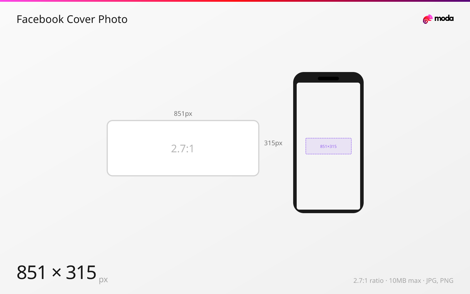 The recommended Facebook cover photo size is 851 × 315 pixels (2.7:1 aspect ratio).