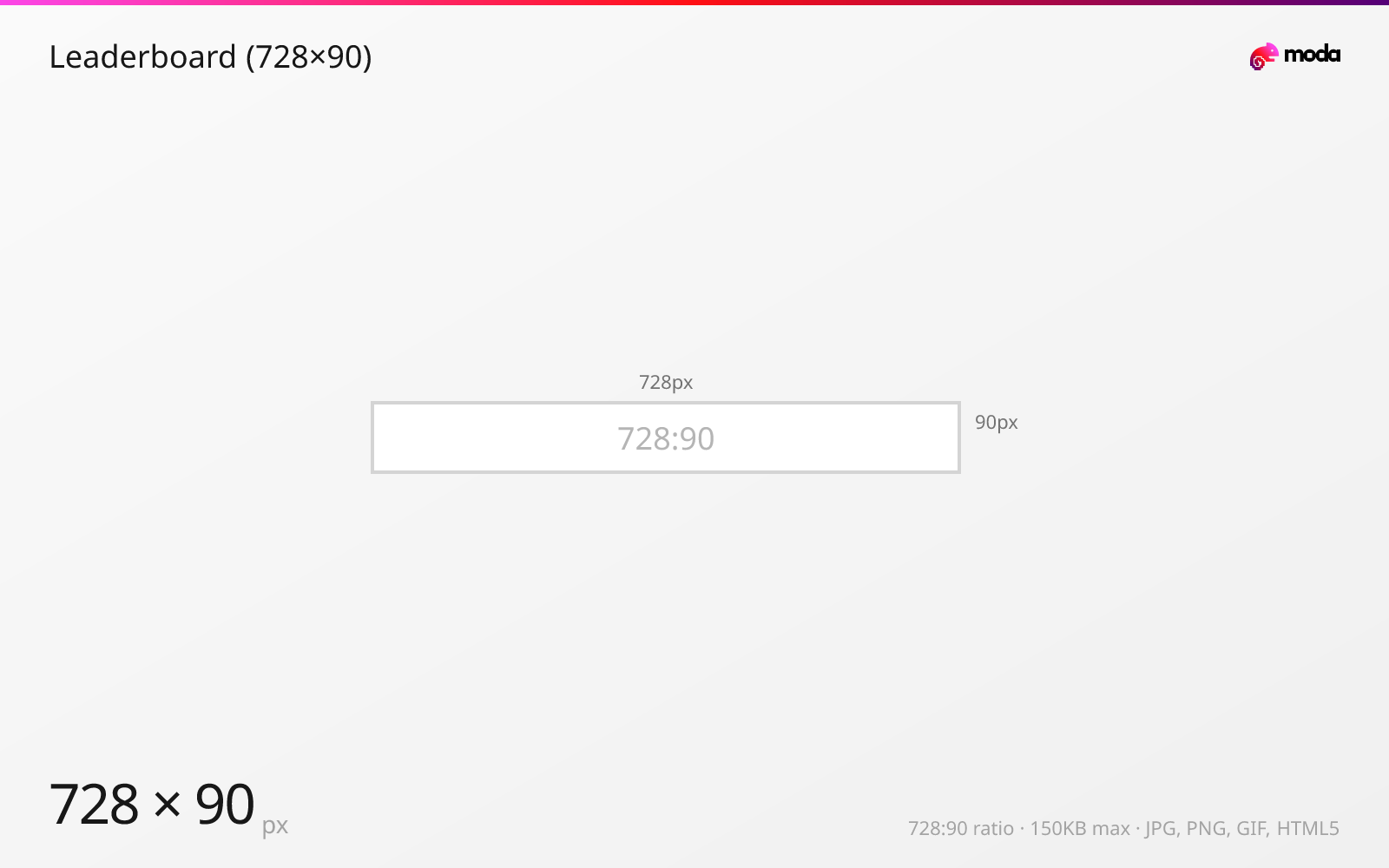 The 728×90 format has been a web advertising staple since the early 2000s. Despite the rise of responsive and native ads, it remains one of the highest-volume ad slots in the Google Display Network. Some publishers also support the wider 970×90 'super leaderboard' in the same position.