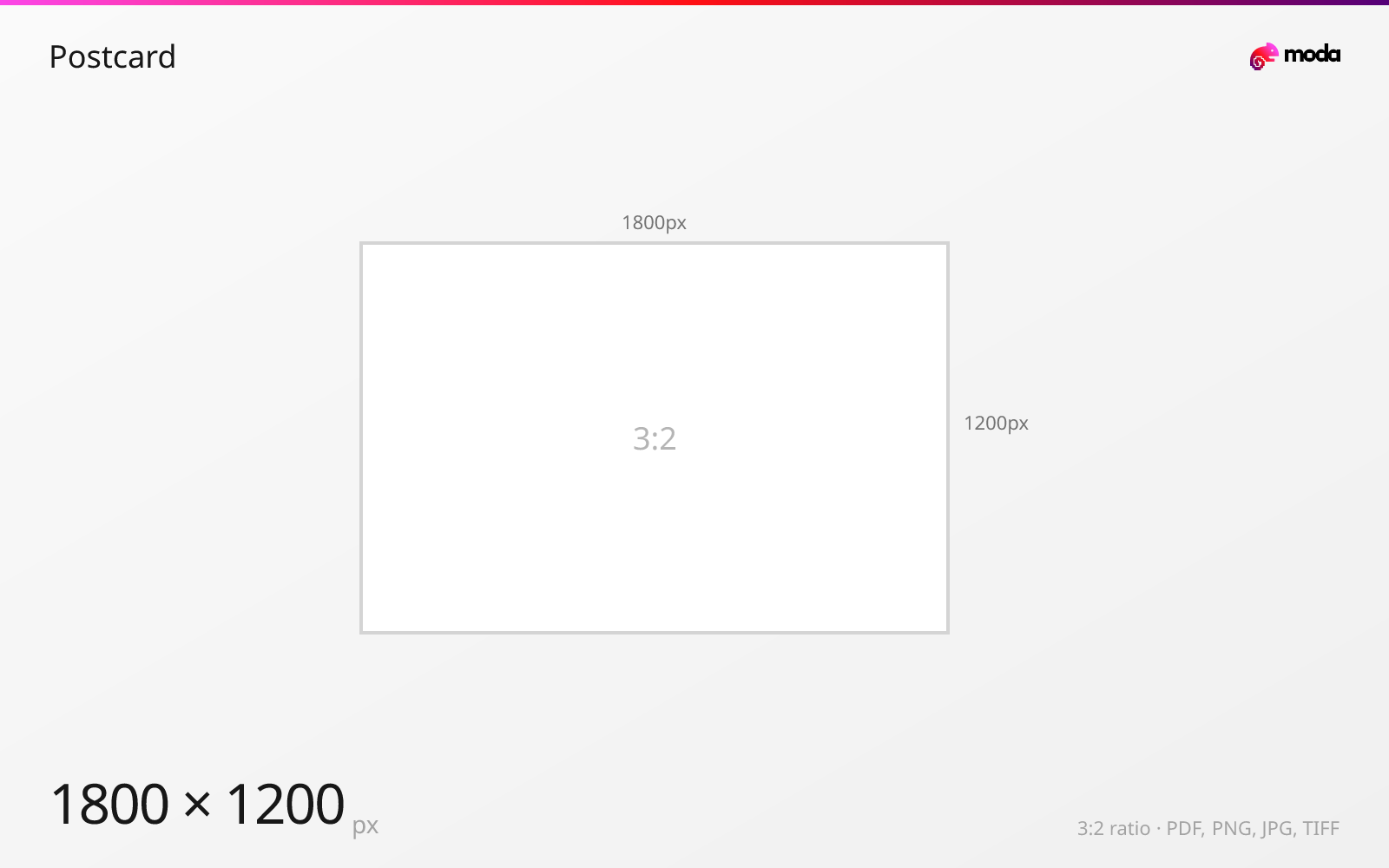 - •Design at 1800×1200px (300 DPI) with 3mm bleed for the standard 6×4" postcard.