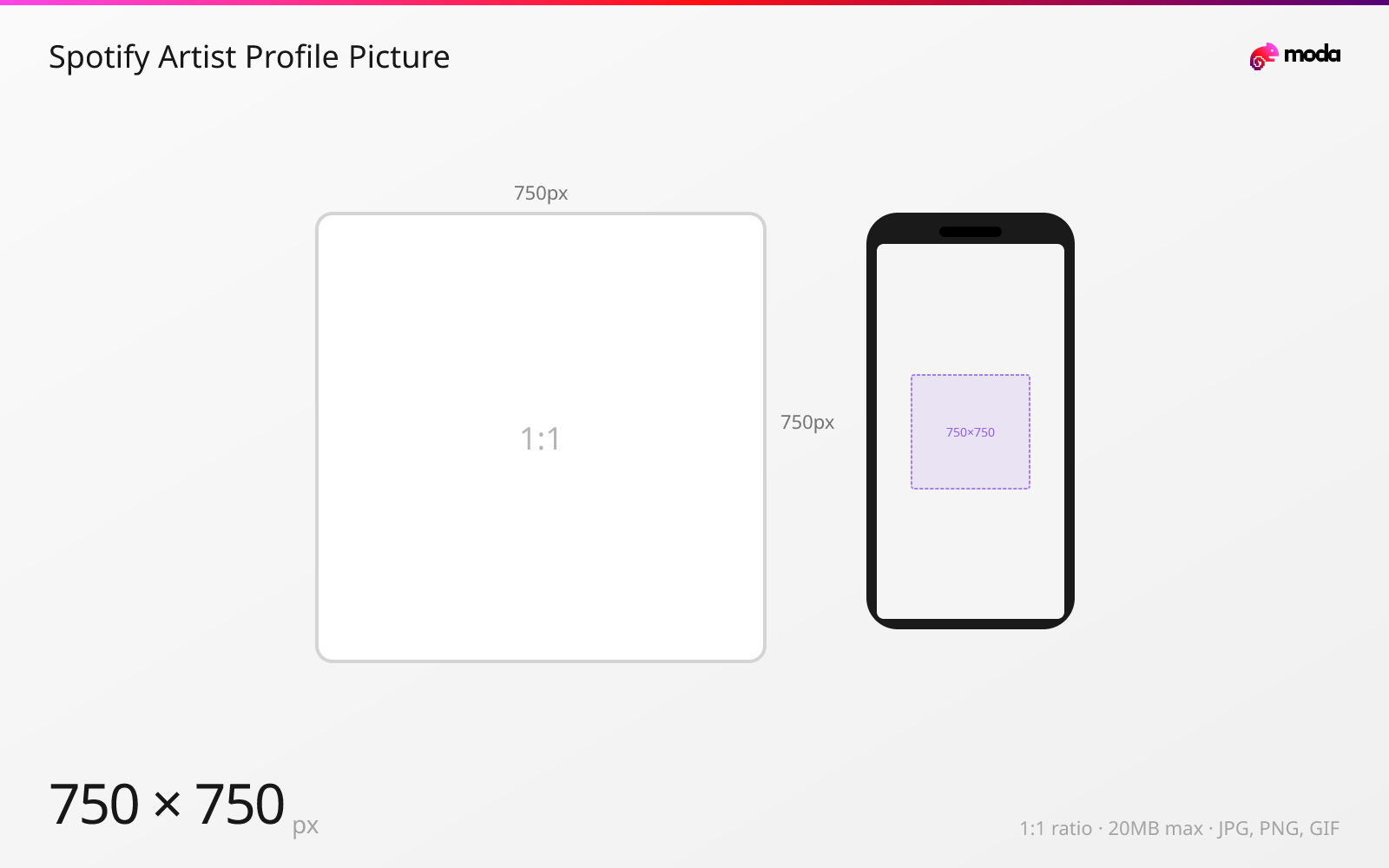 Spotify artist profile pictures must be at least 750×750 pixels in a 1:1 square format. The image is displayed as a circle on the artist page and in search results. Upload through Spotify for Artists — keep the subject centered with wide margins since the circular crop cuts the corners.