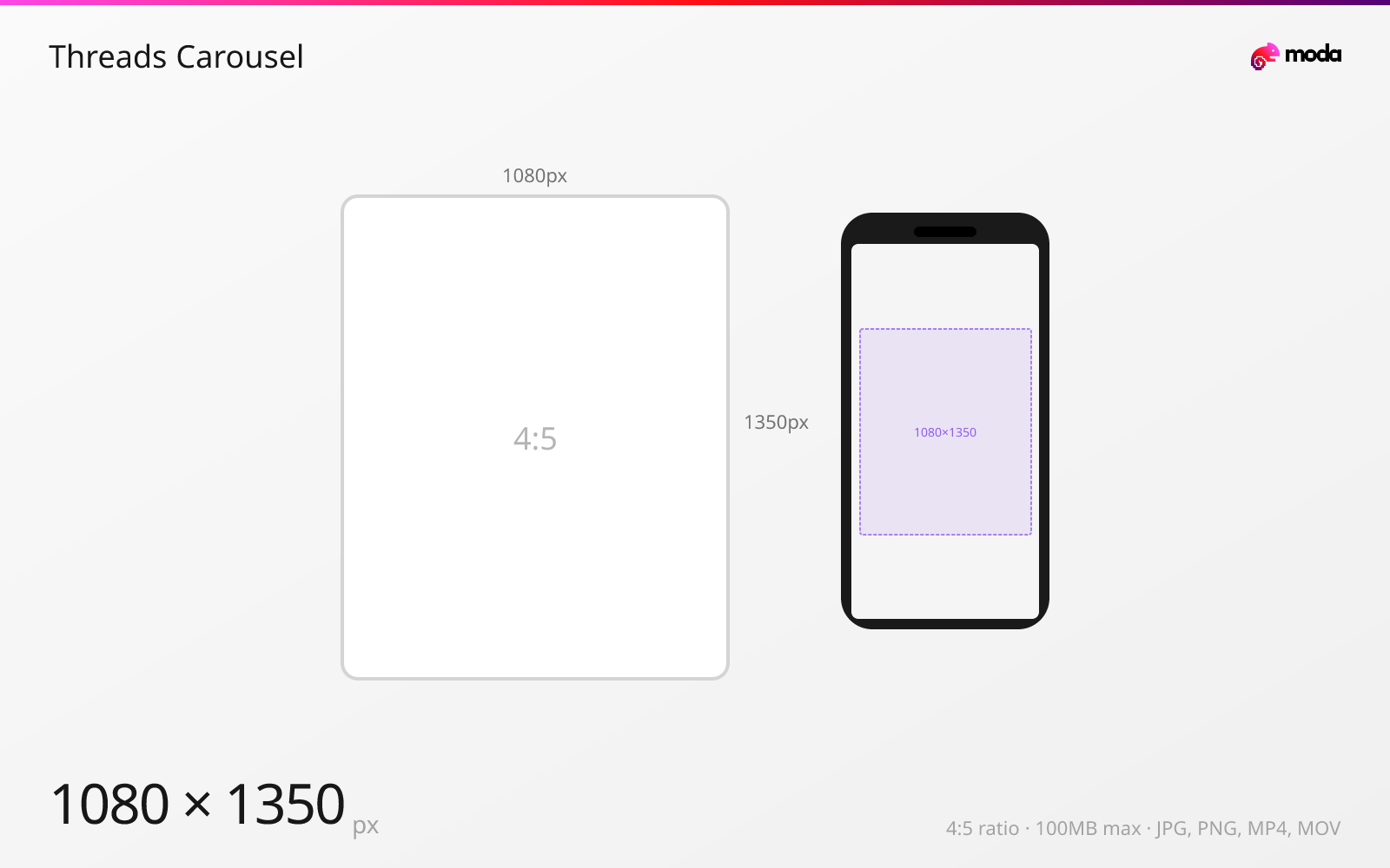 The recommended Threads carousel size is 1080 × 1350 pixels (4:5 aspect ratio).