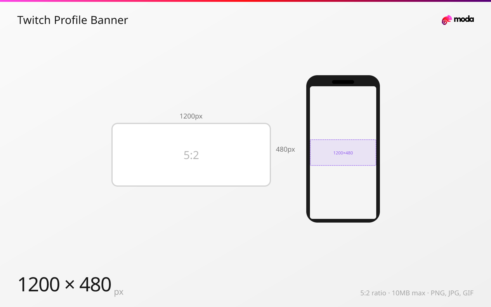 Twitch profile banners are 1200×480 pixels with a 5:2 aspect ratio. The minimum width is 900px. Maximum file size is 10MB.
