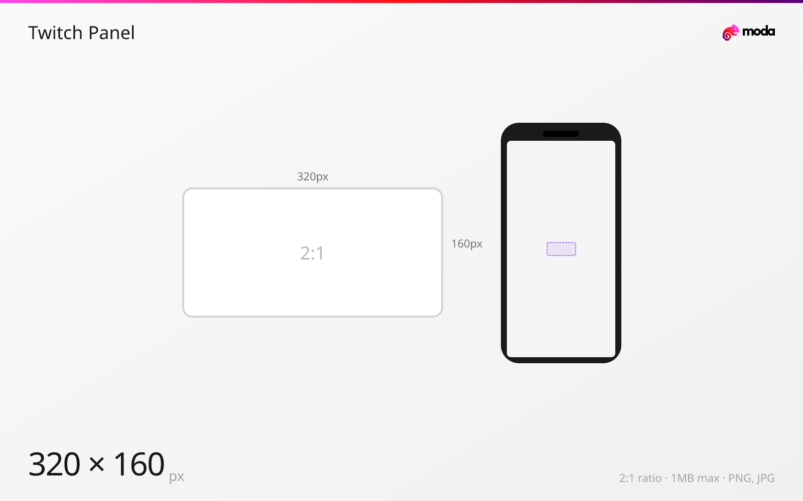 The recommended Twitch panel size is 320 × 160 pixels (2:1 aspect ratio).