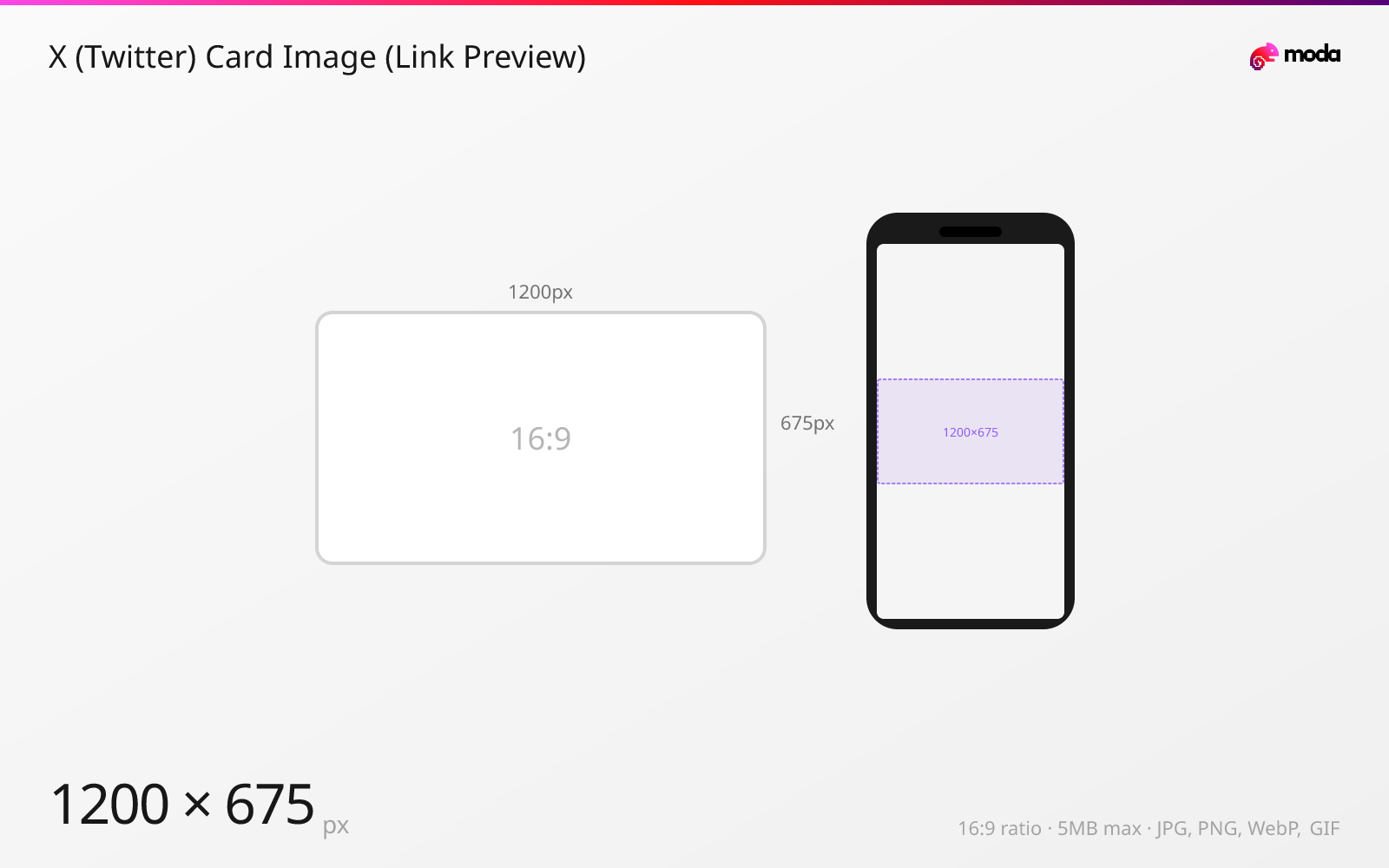 The recommended X (Twitter) card image (link preview) size is 1200 × 675 pixels (16:9 aspect ratio).