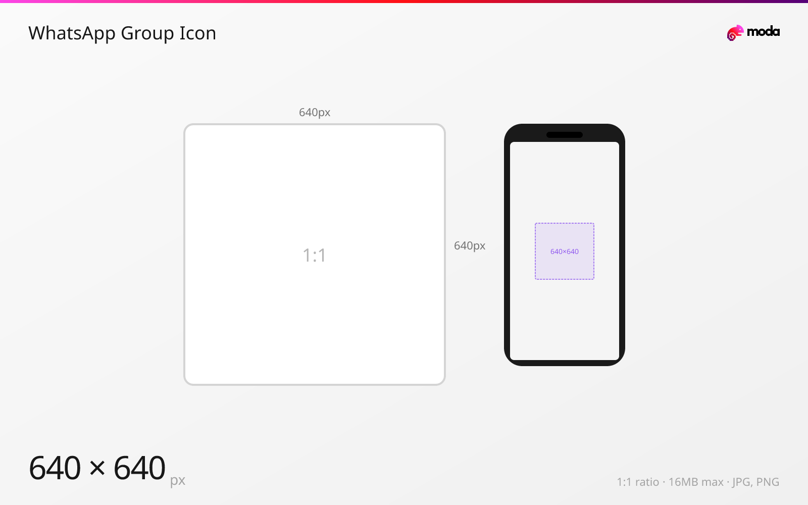 The recommended WhatsApp group icon size is 640 × 640 pixels (1:1 aspect ratio).
